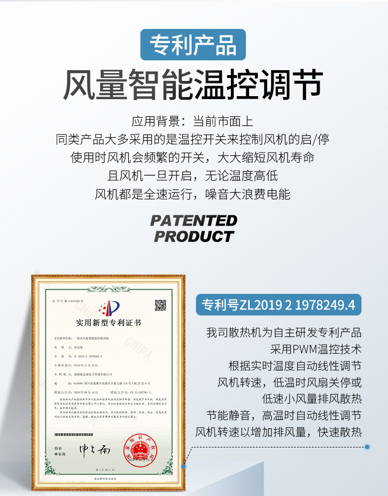 2.專(zhuān)利產(chǎn)品,風(fēng)量智能調(diào)節(jié),風(fēng)機(jī)風(fēng)量和溫度大小成正比,溫度越高風(fēng)機(jī)風(fēng)量越大,溫度越低風(fēng)機(jī)風(fēng)量越小